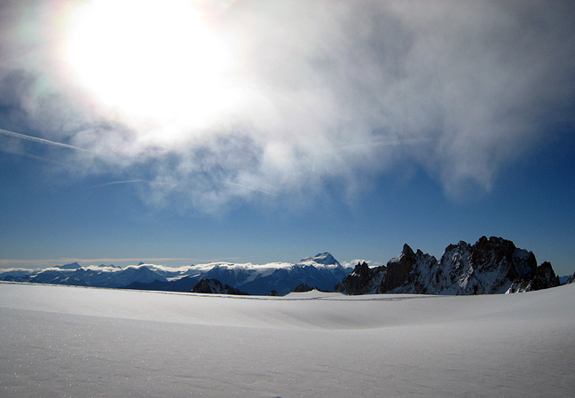 Once through the col at the top of the gully, this gorgeous view over the Trient glacier rewarded us. The Grand Combin in the distance. |