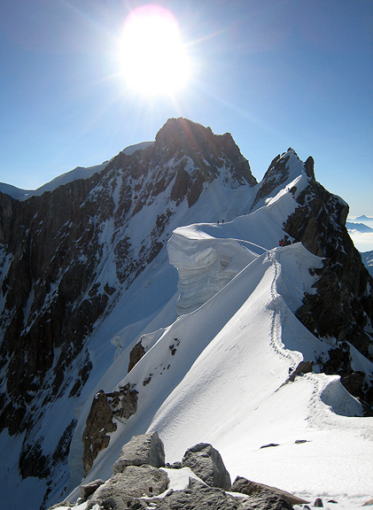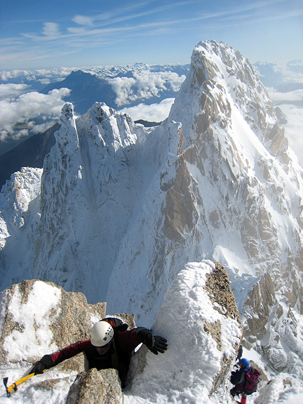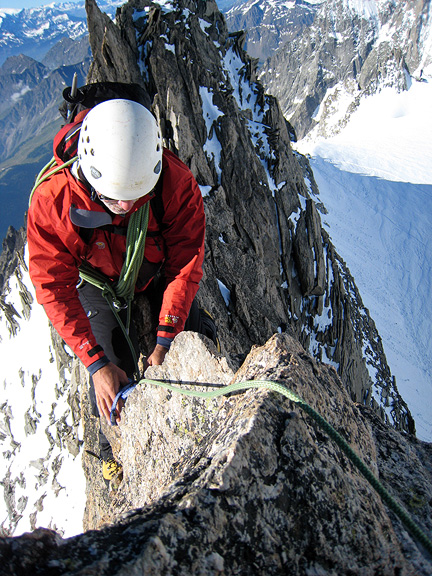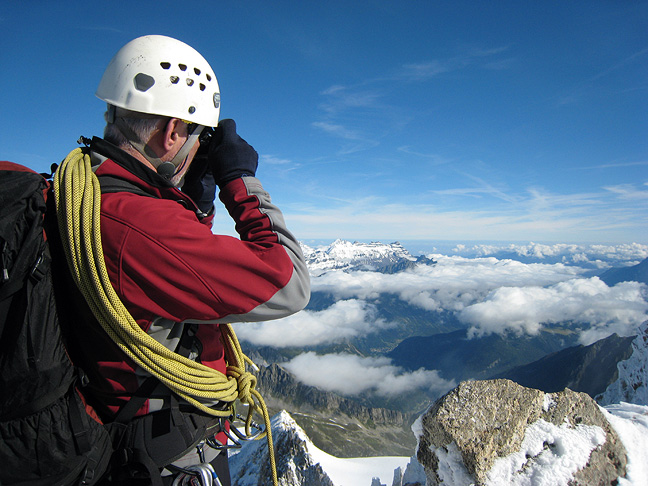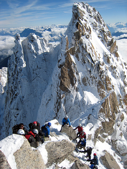 It's a wee pointy summit! Despite the 10 or so pitches climbed, the Pyramide du Tacul is dwarfed by the over-looming East face of the Mont Blanc du Tacul and other nearby towers such as the Grand Capucin in the left background. |