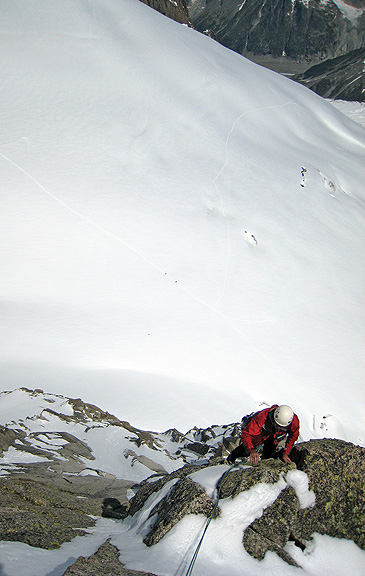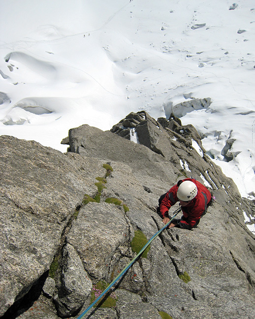 Incredible rock in an incredible location. And only two other parties on the route! The scale of things is made real by the glacier crossers visible down on the snow in this photo. |