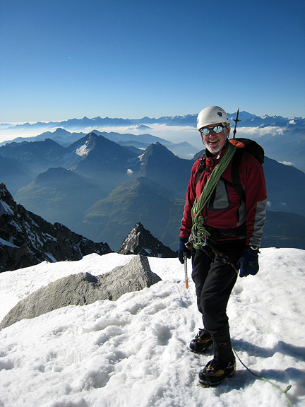 In reality, in the calm air the sun was quite warm. Here Ken enjoys the summit views. |