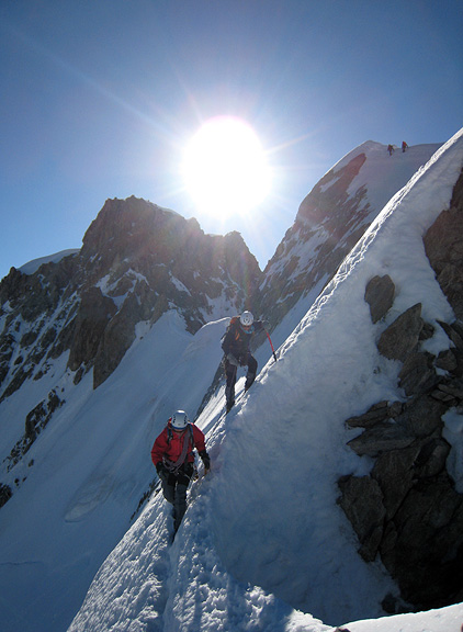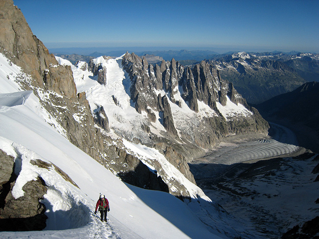 Next we headed up to the Géant Glacier, to climb the Pyramide du Tacul (shown here on right) on our way to the Torino hut. Beautiful granite, the snow rapidly melting off the ledges. |