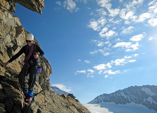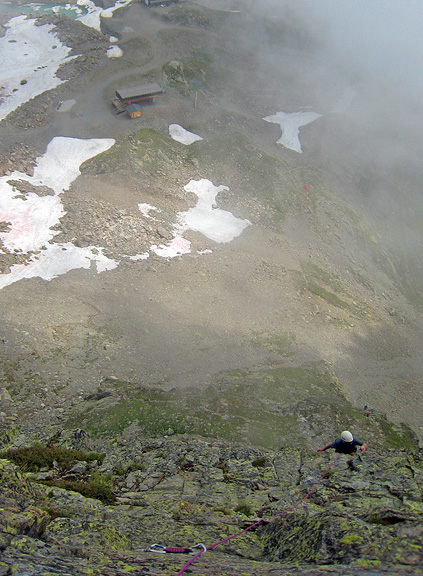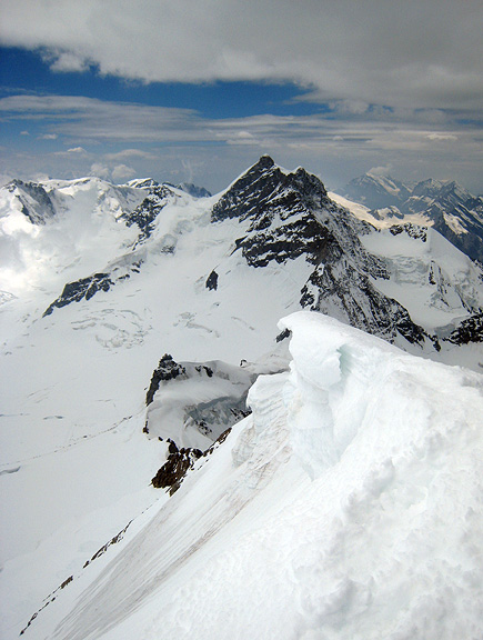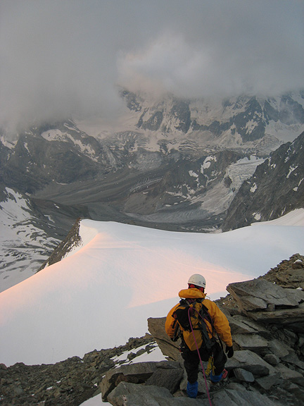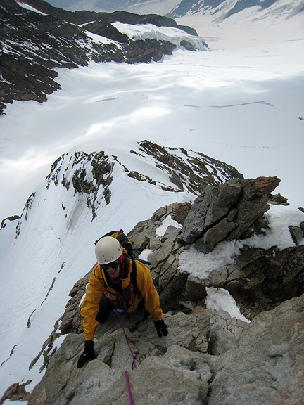 The following day was very, very warm. Despite a mostly clear night, the snow didn't freeze at all. On this short rock section of the Jungfrau, this made no difference, but the deep post-holing across the glacier and up the snowy ridge toward the Rottalsattel was very time consuming. We turned back fearing instability on steep slopes above, and also to avoid being out when the weather should turn nasty as forecast. |