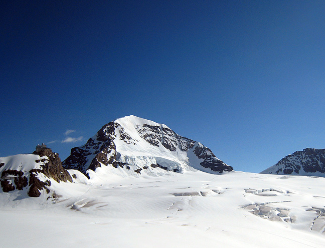 From the summit, great views over to the Jungfrau, and down at the cluster of techno-gadgets bristling at the Jungfraujoch in the center of the picture. |