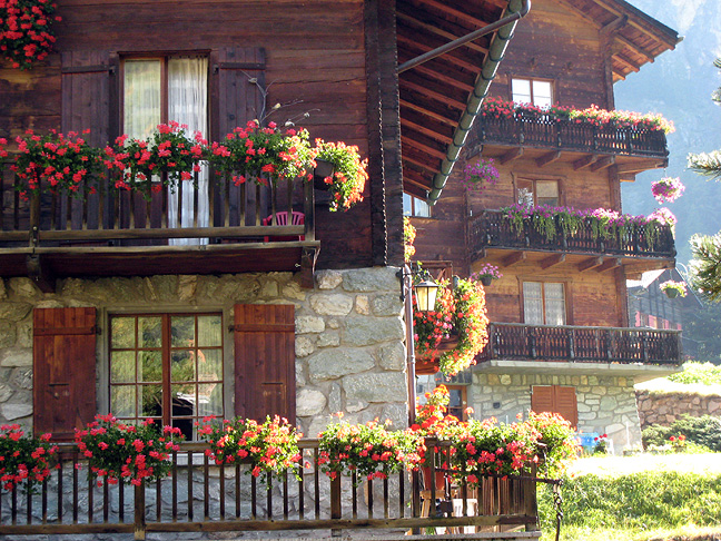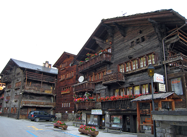 Loathe to continue farther into the back country given the soft glacier conditions and mediocre weather forecasts, we decided to head for the Valais and see if we could get up the Dent Blanche, a less glacier-oriented objective. We spent the night in a small hotel in the charming burgh of Evolène, whose main street is shown here. Beautiful, eccentric old houses with their carved and weathered siding and timbers, accentuate the feeling of "Old Valais" in this village (contrasted by the satellite dish! They haven't figured out yet how to make these out of wood I guess). |