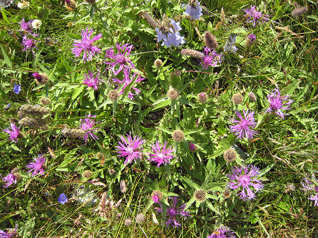 Somebody wondering what we find so interesting up here... a good reason to wear climbing helmets all the way down to the trail. More thunder showers found us at the chairlift station, but we were soon riding back down to town and a good meal (Indian! yum). |