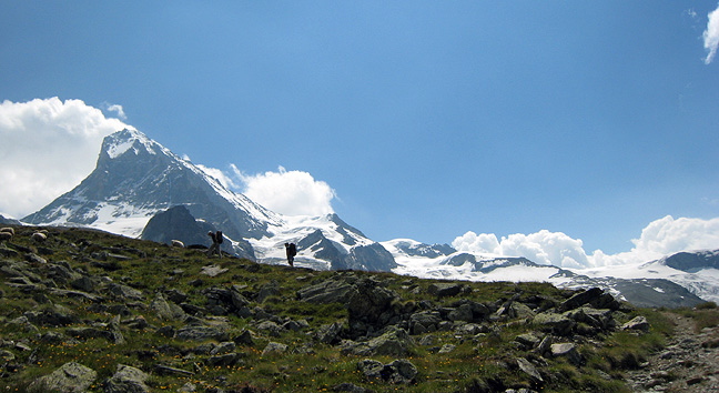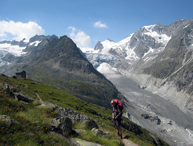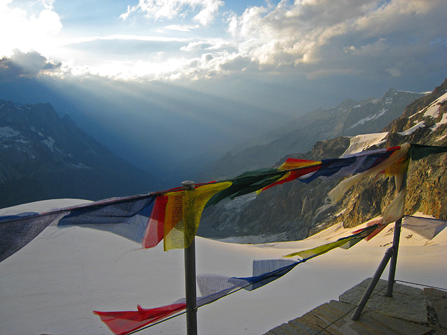 The colorful and welcoming prayer flags at the Rossier hut might reflect the influence of Rinji, the Nepalese assistant hut-keeper who was holding down the fort while his fellow hut-master was on a visit down below. This hut, with its exciting location and views, is a popular stop for those doing the Chamonix - Zermatt (or reverse) summer High Route. |
