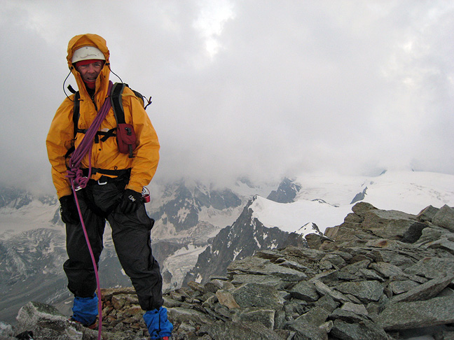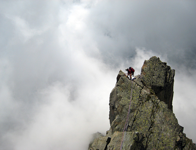 Though high and mid-level clouds moved in as we climbed, we had plenty of time to enjoy the varied climbing on the route. Larry here surmounts a steep rock step near the summit ridge. |