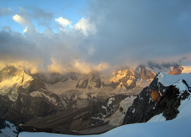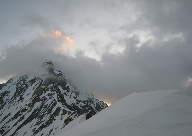 Looking across at the Dent d'Hérens (in the center of this photo, could you but see it), and the Matterhorn (on the left), the light ducked in under the clouds as it rose. |