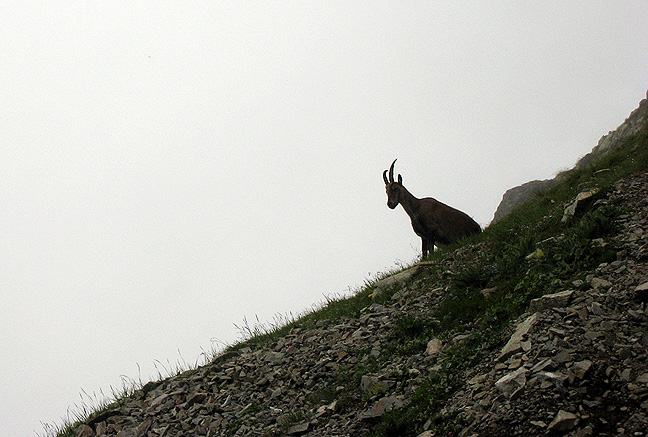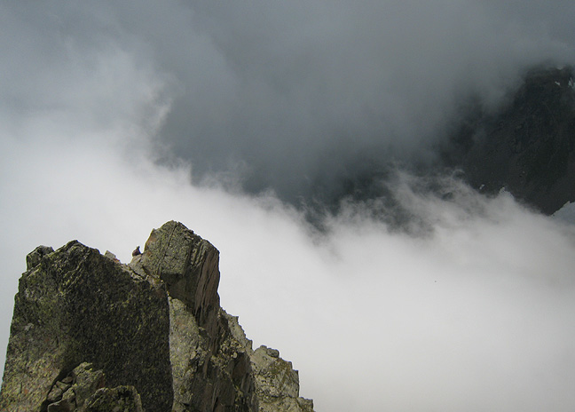 Once again we had a difficult decision to make the following morning. More cumulus building with the dawn, thick cloud cover over the upper part of the ridge, and a cold, stiff wind, took the iron out of our spines. Better safe than sorry, we regretfully turned back once more. |