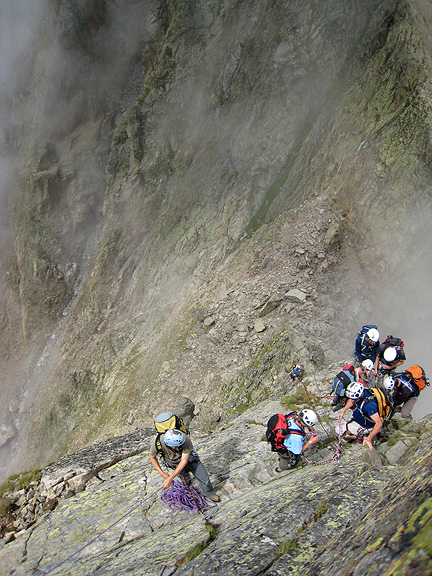 Our route joins the "normal" SE ridge route near the summit, where we merged with the flow of traffic, shown here. A welcome sun break lent contrast to the generally misty conditions of the day. |