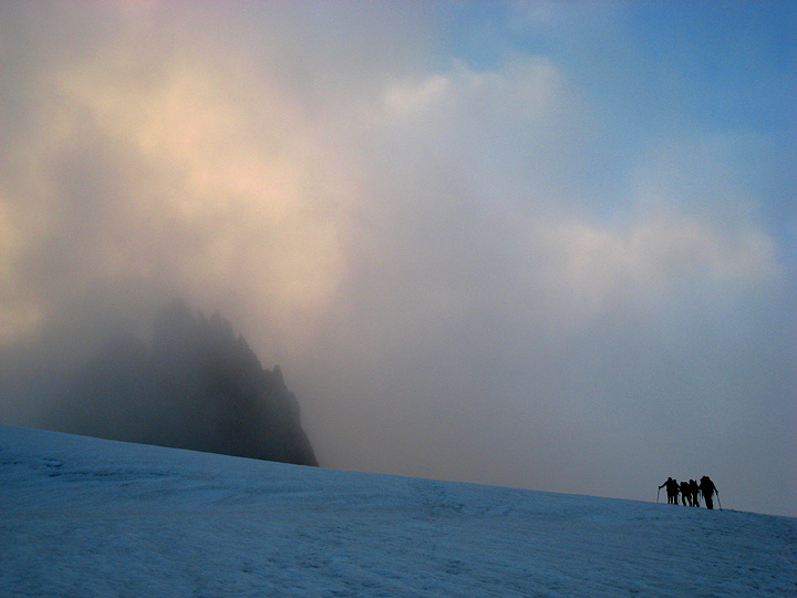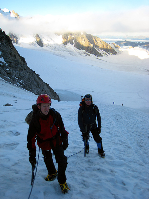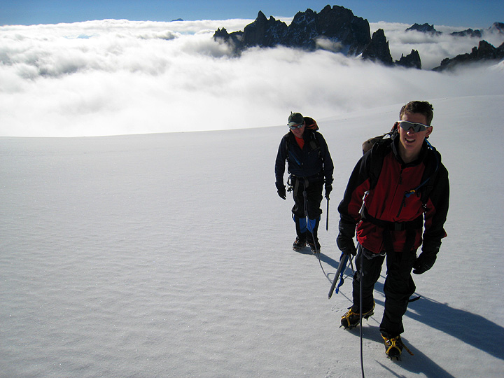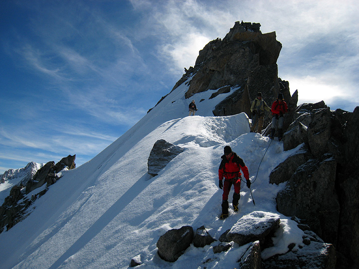 The Petite Aiguille Verte is a fun route, with a bit of easy glacier, then a rock and snow ridge to the summit. With a bit of rain the previous night, and cool temperatures, the peak picked up a trace of new snow, necessitating the use of crampons all the way to the top. In this photo, another party in descent passes us as we head up. |