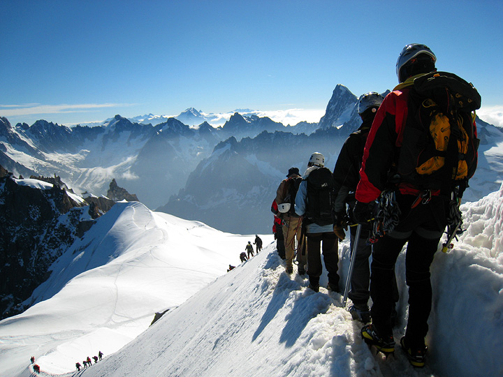 The view east from the Midi. The "approach" arête, taken in descent. The big peaks of the Swiss Valais in the distance, Weisshorn, Dent Blanche, Grand Combin, Matterhorn and the Monte Rosa summits. |