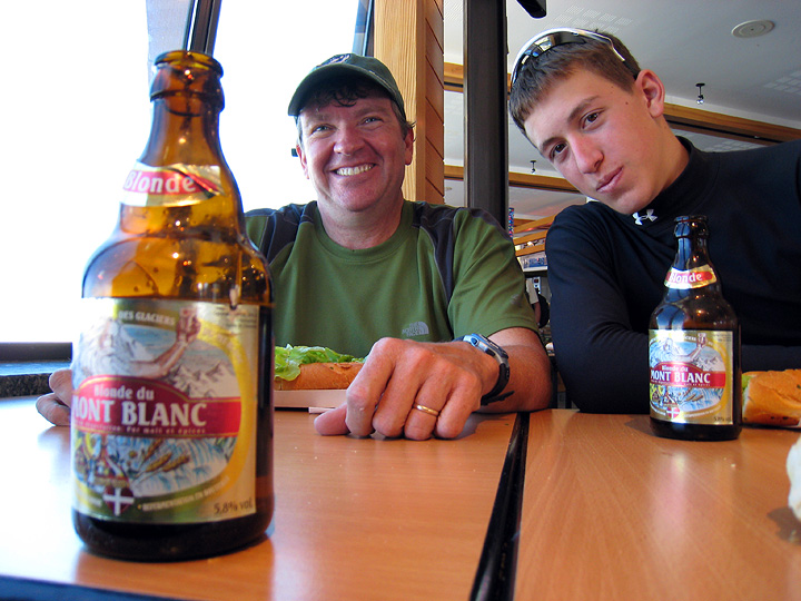 In no rush to descend to Chamonix, Bruce and Mike sample the local "Blonde du Mont Blanc" at one of the several restaurants tunneled into the summit of the Midi. |