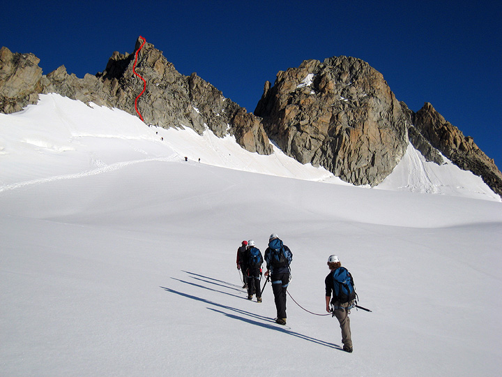Another party approaches the Aiguille du Tour. Our route marked in red. |