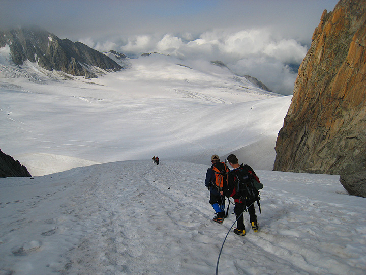| Coming from their home in Virginia, Bruce Beaman, and son Mike joined Mark for 4 days of climbing in the Chamonix area. Also with them, though staying off the steeper stuff, was Bruce's wife Cindy. Cindy did join us for the ascents of the Aiguille du Midi (cable car route) as well as on the the Grand Montets. Early August has had some tumultuous weather, but with adjustments to our itinerary we were able to put the one really bad day to good use with an approach to a hut. |