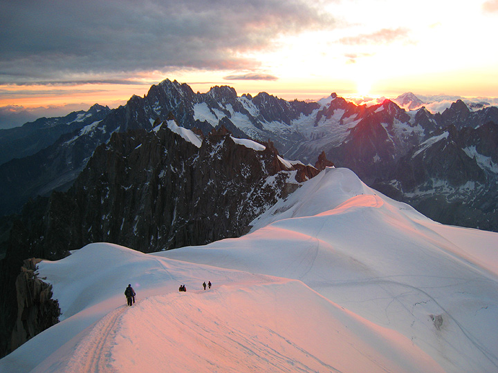 The morning of our first day. The sun rises through threatening clouds and we start the Midi-Plan Traverse. |