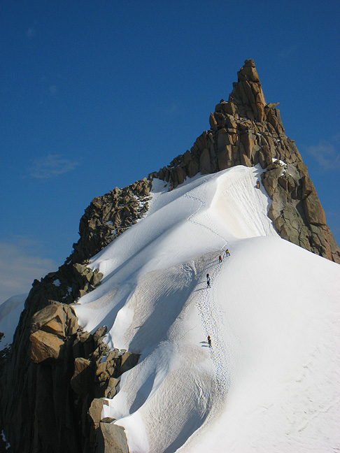 After a day of pure rain (spent cruising the shops in Chamonix) the weather cleared magnificently. With the high country blanketed in a couple feet of new snow, options were limited. We did, however, enjoy a fun climb of the Cosmiques Arête. |