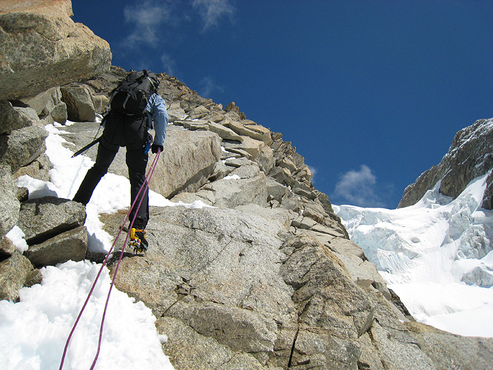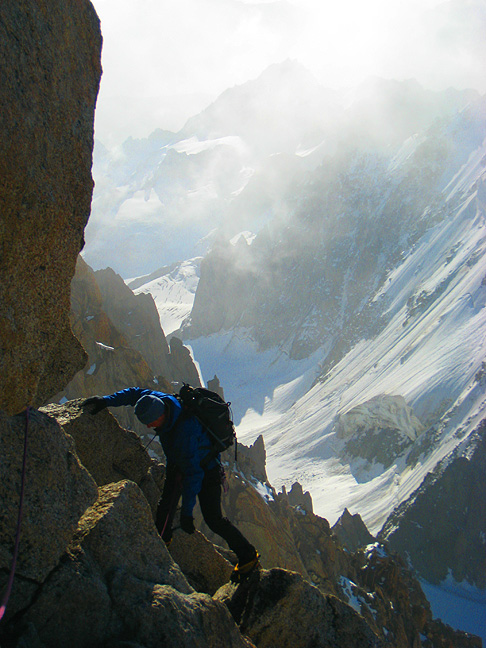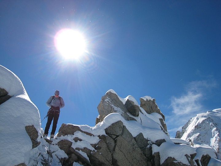 Grant works his way out to the rappel point on the way to the Aiguille du Plan. Because of the other recent storms of the season, the route was in exceptionally good condition. The steep slopes below are often quite icy and a bit tricky, but with the good snow, the track was in perfect condition. |