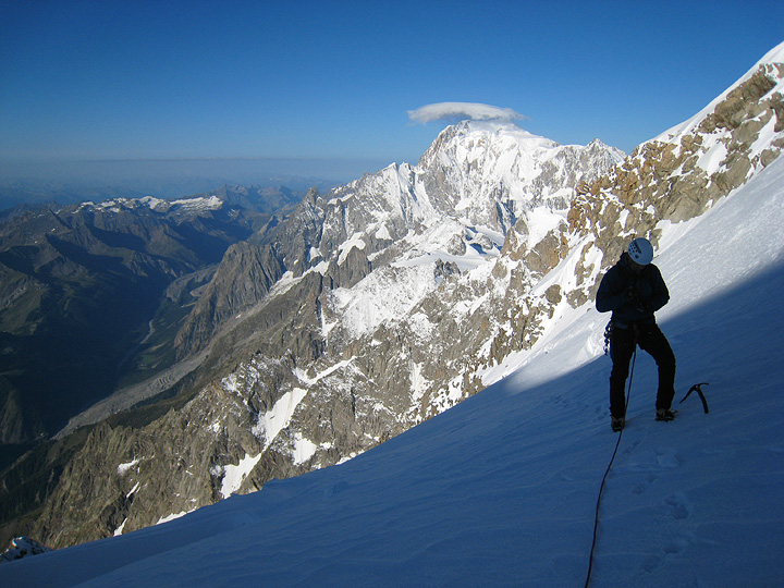 Almost at the summit of the Grandes Jorasses. Mont Blanc, with a lenticular cloud, behind. |