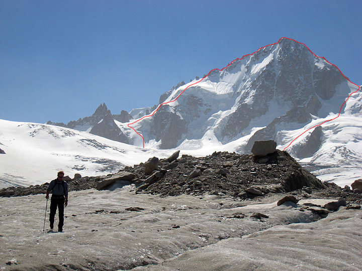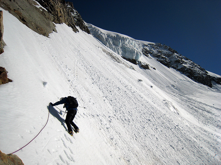 Arriving back at the rocks of the Whymper Spur. On the way up we diagonalled up and right from this point passing between the rock on the left and the ice cliff on the right. Though relatively quick, it was long and tiring. You can make out our tracks in the snow. On the descent, we took the "normal" route, down the snowed-up rock on the right skyline and across the low-angled glacier. |