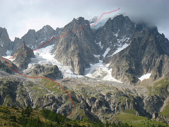One of the great peaks on Grant's "tick list" was the Grandes Jorasses. With much new snow on the shady north sides of ridges, we opted for the normal route, which climbs from Italy and the Val Ferret. This view show the route to the cloud covered summit. The hut is just out of view to the left. |