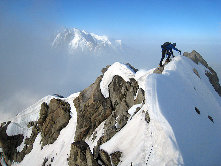 Grant arrives on the summit. The Aiguille Verte floats in the clouds behind. |
