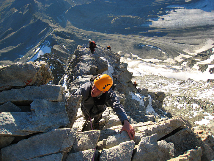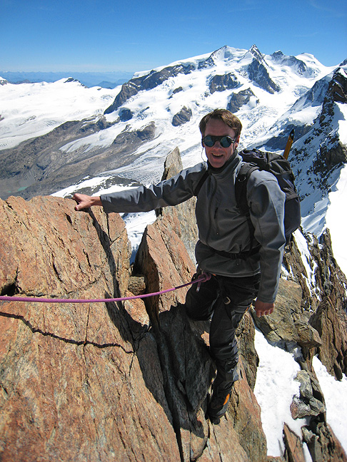 Great rock and a fine position on the Breithorn. Monte Rosa behind. |