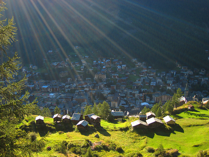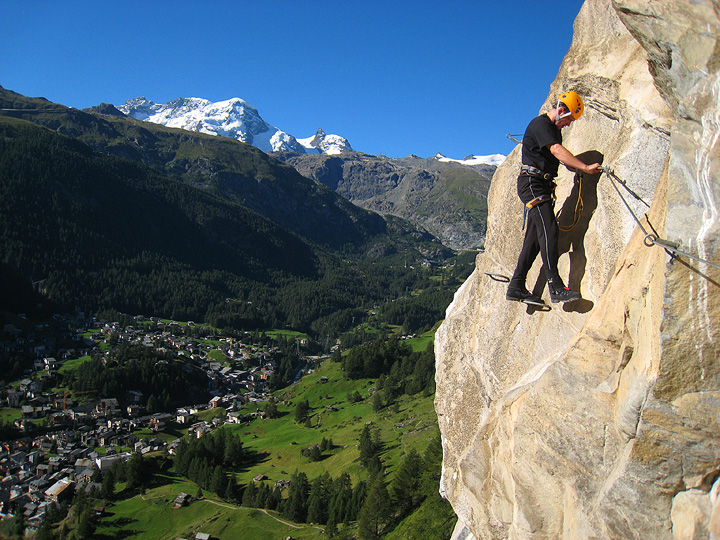 The forecast looked good for a Monday ascent. As the hike up to the Hörnli hut is only a couple hours long, we decided to make a fuller day of it by enjoying the new via ferrata located just above Zermatt. Here, in the morning sun we approach the route. |