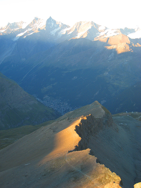 On our first day, we climbed the Half Traverse of the Breithorn. This is a great warm-up, and, as you can see offers some great views. This photo was taken while on the summit of the Breithorn after our climb. |