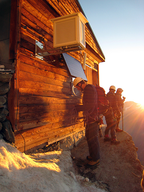 With a 3:30 am wake up, we were off by 4 am. Here we arrive at the Solvay hut with the sun at 6:20 in the morning. |