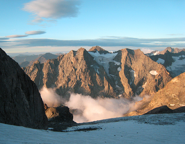 Moving on to the Ecrins, we climbed Mont Pelvoux, having learned from the local guides' office that a dangerous sérac barrier on the Barre des Ecrins was even more unstable and threatening than usual this year. |