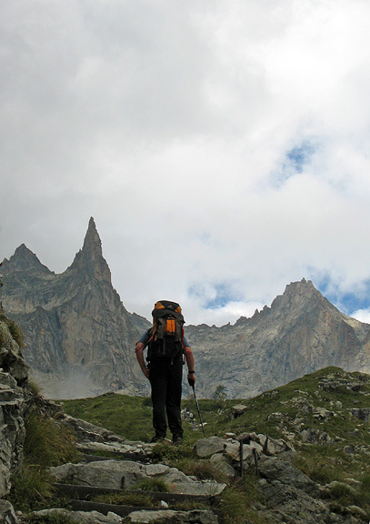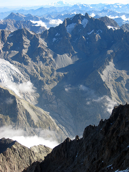 Looking down toward the north (the direction of our descent), one gets the sense of the enormous vertical relief of this area. These wild, deep valleys, largely un-developed and absent the grazing livestock, cheery chalets and alpine meadows found elsewhere in the Alps, reminded me of the Cascades (on steroids). In the distance, Mont Blanc peeks over the horizon. |