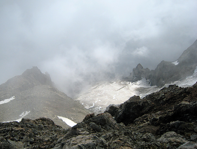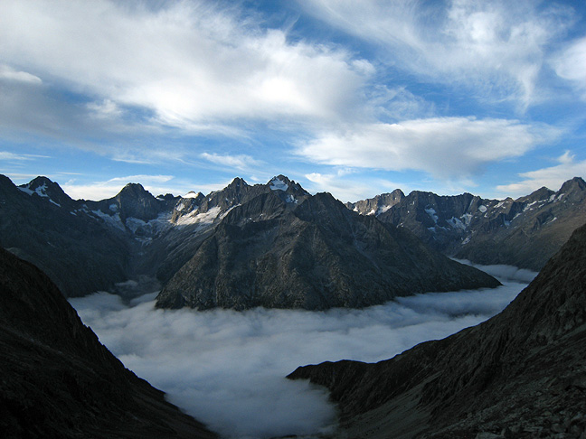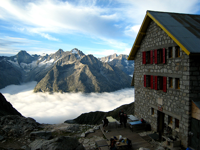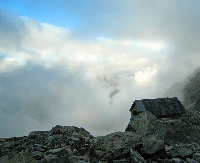 The valley clouds shifted but never cleared out the evening of our arrival at the Soreiller hut. |