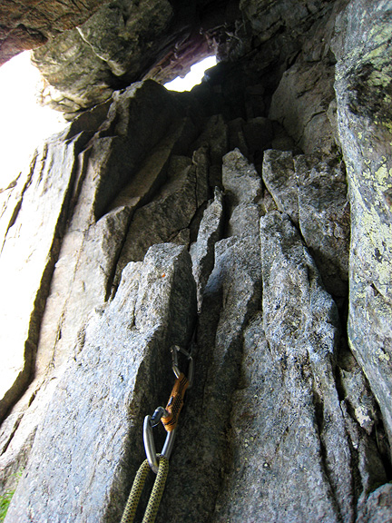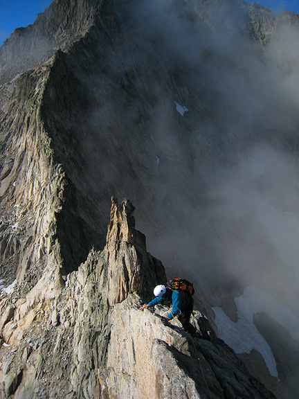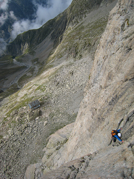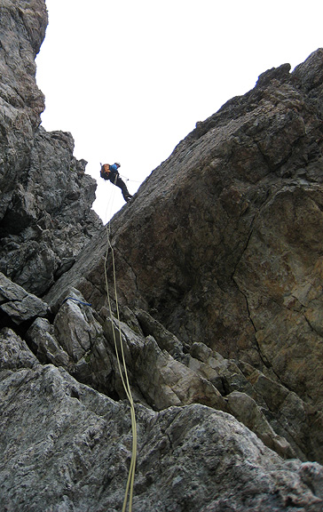 Scrambling over toward the easy rappel descent, we start to hurry; it's almost dinner time at the hut! |