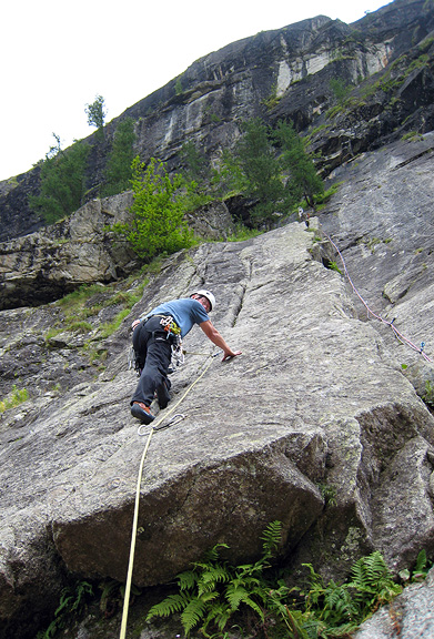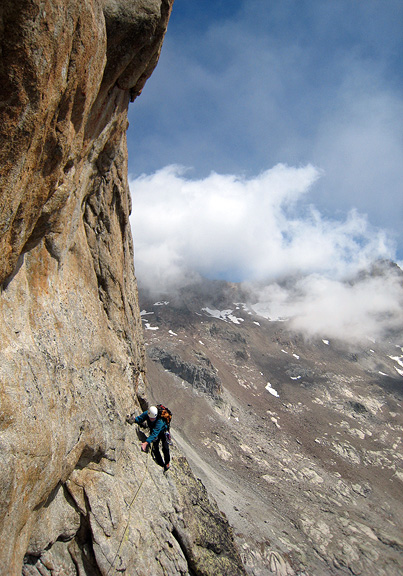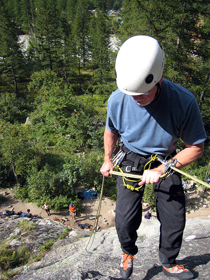 After our enormous day on Mont Pelvoux, we were ready for a bit more rock climbing to stretch our stiff legs and give the backs a rest. Andy furthers his progress as a leader on rock. |