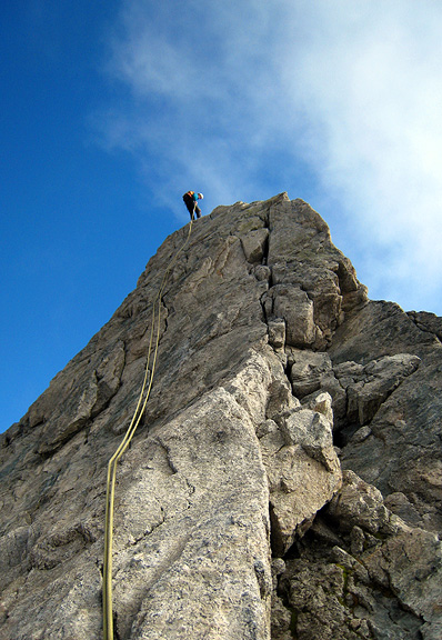 The sun begins to make its appearance at last, as we exit the Madier route and take up the Berthet route for a few pitches. |