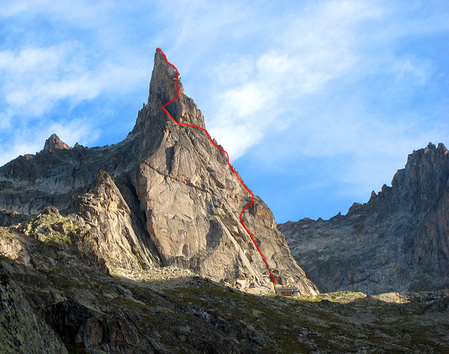 Our first view of our goal: the incredible-looking Aiguille Dibona. We are told there is a "moderate" route up this thing, but this begins to look unlikely....!? |