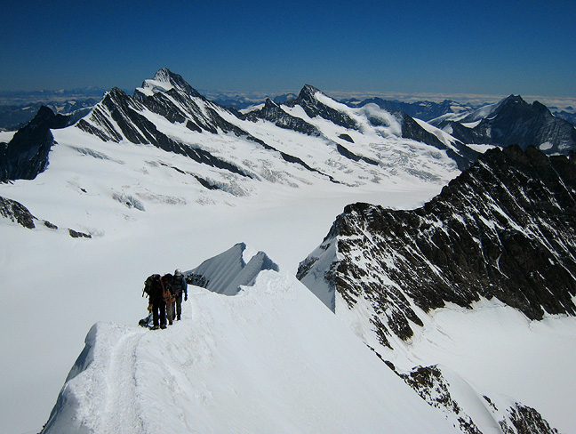 We started out in the Bernese Oberland, on the Mönch. Mo pauses here to enjoy the views, as we scritch-scratch our way up the mostly snow-covered rock, in crampons. |