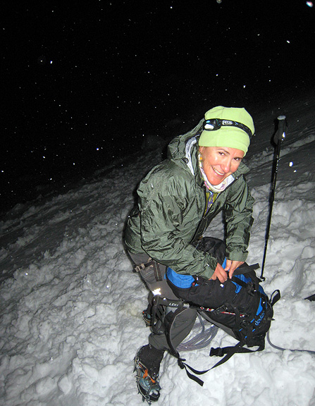 The following day's program was to climb the Jungfrau—normally a dawn start; however the weather forecast called for heavy rain/snow/thunderstorms from early to mid-morning, so we headed off much closer to midnight than first light. Despite this, it was snowing even before daybreak. Mo here pulls out the heavy gloves as we approach the Rottalsattel at about 3800 meters. Brrrr! |