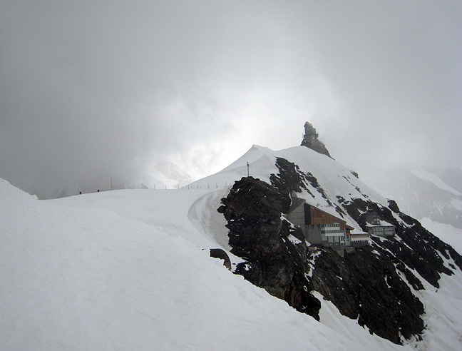 Poor visibility combined with icy wind and heavily-falling snow convinced us this was not the day to summit. We retreated to the welcoming warmth of the Jungfraujoch station, where a small crowd of climbers sat waiting for the coffee shop to open up with the first train of the morning. |