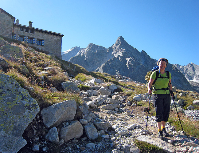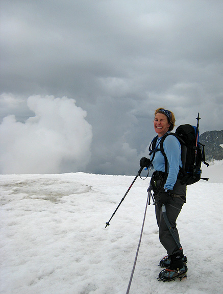 | Elizabeth Moceri from Seattle, WA came climbing with Kathy this summer, following on her "Princess Tour" of two years back. Mo has done at least as many climbing and skiing trips with us as anyone! But although she has done every alps ski mountaineering tour we've ever offered, as well as several mountaineering expeditions, this was just her second trip with Kathy in the summertime Alps. The hut we stayed in near the Piz Bernina, as well as a certain prevailing attitude, led us to dub this year's trip the "Diavolezza Tour". |