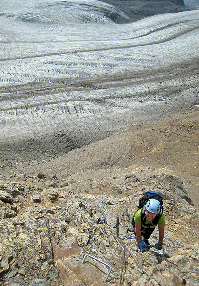 The next day, it was back to the hills! Mo starts up the "Klettersteig" on Piz Trovat, next to the Diavolezza hut, high above the glacier. |
