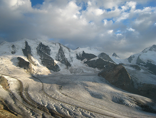 Once more the changeable weather influenced our plans. Our original program was to climb from the Diavolezza hut to the Marco e Rosa hut via the "Fortezza" (the fin of rock in the right of this photo), and from there to climb the Piz Bernina—out of sight on the right. But the weather gods were offering only one good day for climbing, so we chose to use it to traverse the Piz Palu (the peak on the left). Our route, after the Fortezza, joins and follows from left to right, the skyline of Piz Palu. This was the view from the terrace of the Diavolezza hut, on the evening before our climb. |