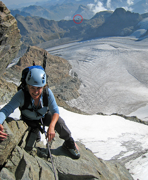 After, frankly, a very long glacier and talus approach (see the teensy weensy Diavolezza hut far, far below in the red circle), the climbing high up on the Fortezza is exciting and scenic. The morning's weather was beautiful... |