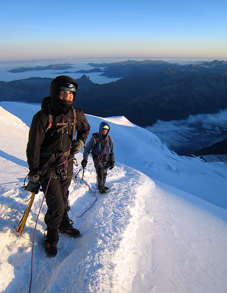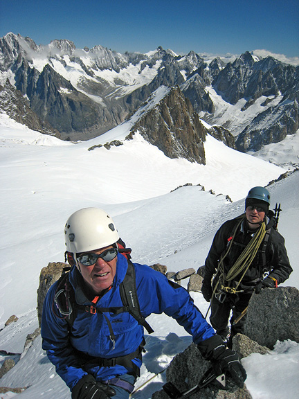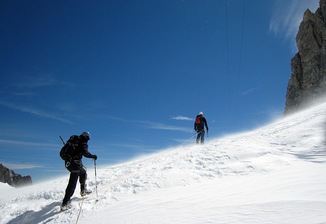 The following day, it was more steep snow and ice practice on the Aiguille de Toule, and more icy wind! Here Brian begins to lose sensation in his toes and fingers as the bitter cold becomes really unpleasant! At least we broke out into the sun here. |