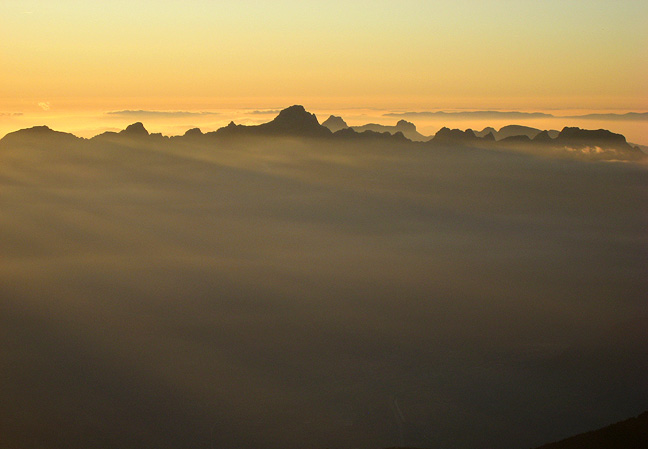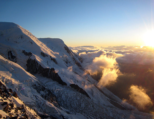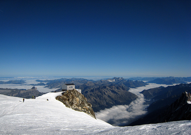 Descending back to the Vallot hut, the sun finally has some real warmth to it. The valley fog begins to thin out over Chamonix. |