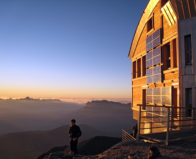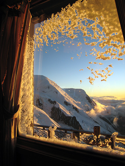 In the Cosmiques hut that evening, we were warm and cozy behind the obviously quite effective thermal windows. A nice place from which to watch the sun set. |