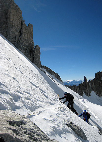 After some snow and ice climbing practice on the Argentière glacier and environs, we headed up to the Pointe Lachenal for some application of technique. Beautiful weather as you can see, though the temperature was arctic, and the winds very strong at altitude and forecast to get worse. |