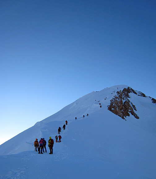 After all our acclimatization, and the hurry-up provided by the still very strong and glacial wind, we were quite high on Mont Blanc the next morning by the time the sun got over the horizon. Pausing briefly at about 4600 meters, we found we had caught up with the climbers starting from the Gouter hut. When WILL that sun come up?!?!? |