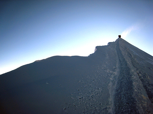 The end at last in sight, we still had to bear the ice crystals in the face carried by a strong cross wind on the summit ridge. Just a few more steps though. |